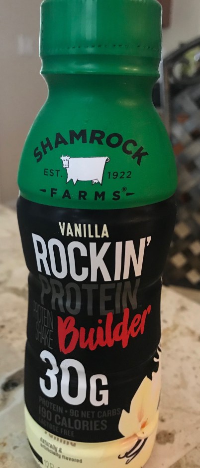 As I suspected my numbers are shifting downward. Down another 110-150 calories a day…. no big deal. But that protein number is so damn hard to hit! I feel like I need to inhale shrimp by the pound daily to make it work or supplement with a protein drink. And right now my go to drink is Shamrock Farms Rockin’ Protein Builder. 190 calories, 30g protein, 4 g fat and 12 carbs.