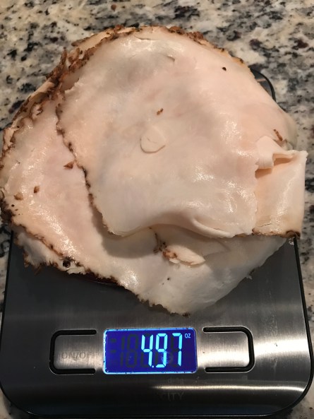 Hello, chicken again: rotisserie chicken flavored Boar’s Head deli meat. Yup, I said it. Sandwich meat. Not the processed nasty stuff that comes prepackaged. I’m talking about the freshly sliced deli meat, sliced thin so you can feel like you are eating more. If you haven’t tried it, it’s a good protein to eat. See my scale pic for this yummo. And I can add this to the end a day to top off my protein numbers.