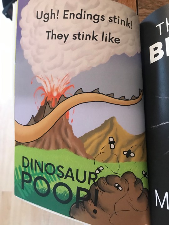If you’ve read our book, you know (and spoiler alert if you haven’t), Chick 1 won this debate. Dinosaur poop made the cut for The End. The illustration is awesome (as you can see above!)  Kids LOVE it.  LOVE IT!  And at our author events, Chick 1 always has to read that part! (Chick 2 still gets a little embarrassed and flushed – ha! – when that page appears.) Coincidentally, that is Chick 1’s favorite page, so it all works out in the end.