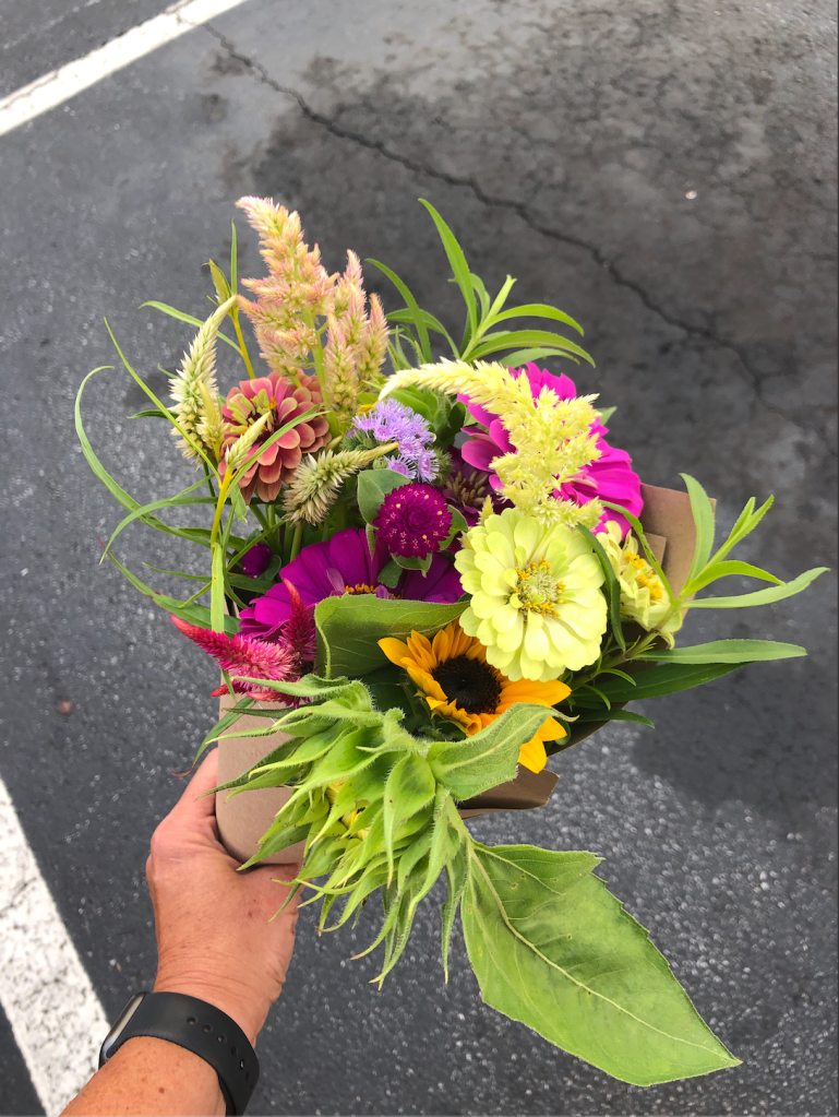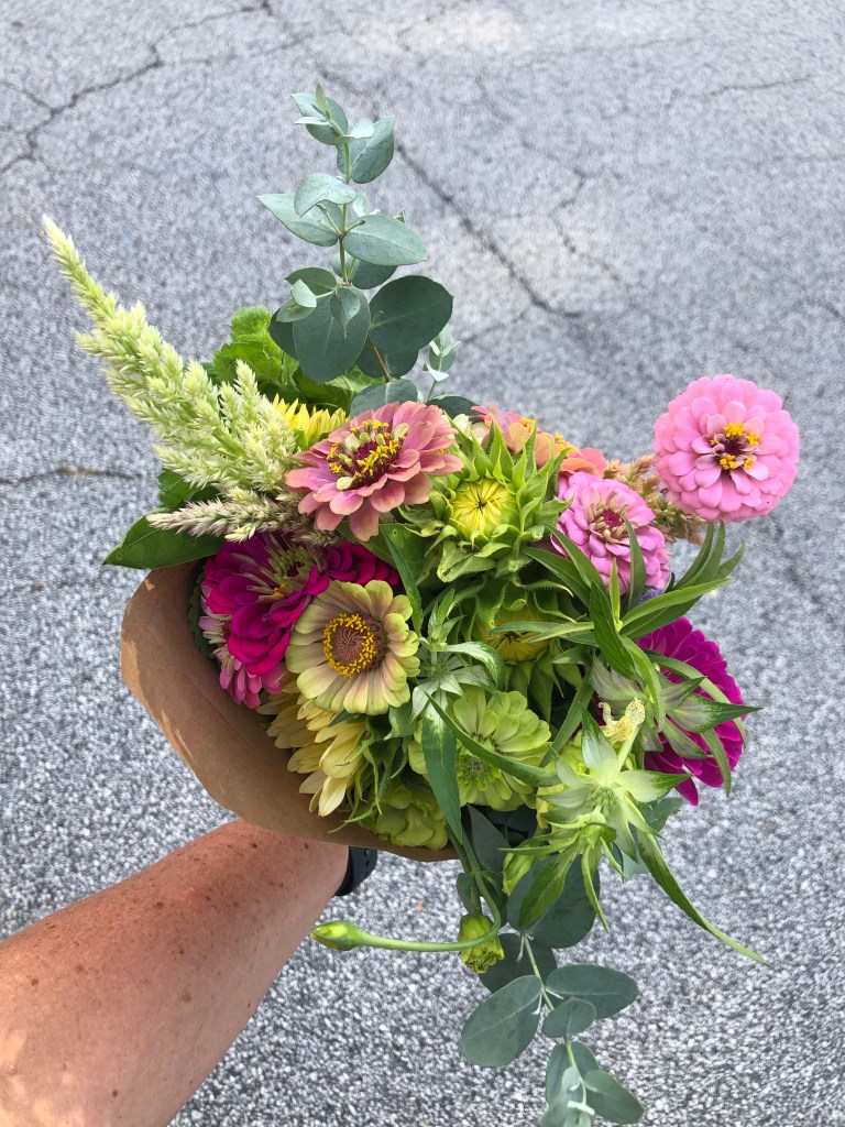 My house is abundant with zinnias much of the summer and I LOVE them. So why go elsewhere, you ask? Flowers from the Seed to Petal Flower Farm are so different than my own. She has unusual varieties and puts them together beautifully. I loved picking them up and seeing them on my table all week. A smile and a wink just for me. We all need those little boosts.