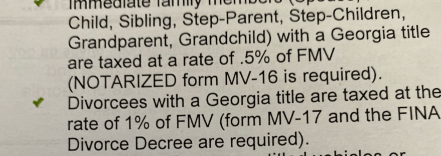 The fine print on one sign notes that if you exchange vehicles from a family member or property is part of a divorce the tax rate is minimal or greatly reduced. The reading of said sign saved thousands of dollars for my family member. So excited to see this.