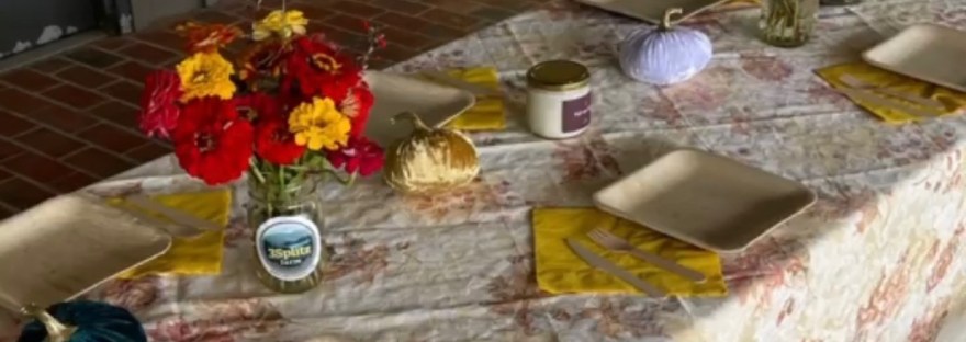 A white tablecloth was the foundation. Topped by a fall-themed tablecloth with muted hues. Draped with care over the metal picnic table. Then, fancy bamboo plates and utensils. Yellow napkins folded at each place. Then, the finishing touches…jewel-colored velvet pumpkins that later doubled as party favors / remembrances for each of the women there. A fall candle bought brand new for the occasion, glowing and sharing a hint of apple scent. A table worthy of special guests. Even out in the middle of the soccer fields and playgrounds. Then, a build-your-own lunch spread courtesy of Trader Joe’s. Nothing too fussy. Just nibbles to try.