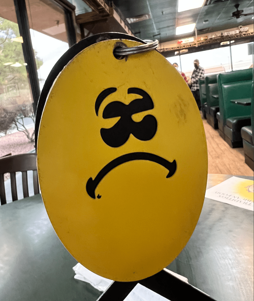 Then I notice some reviews and a photo that mention little stands in the middle of each table. They are happy / sad faces…bright and flippable. When you need something from a server, flip to the sad face. If you’re all good, keep it happy.