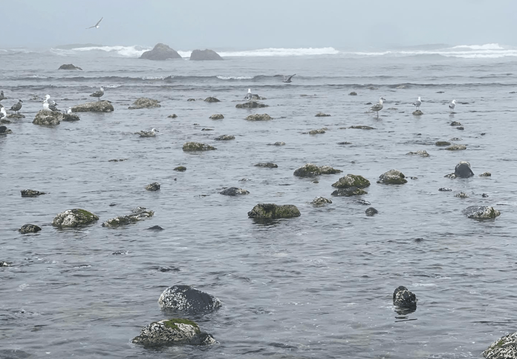 The waves hit the rocks with a force. The sound of the ocean was present. There were plenty of people visiting on this foggy day. I heard many accents and languages around me. The sand had small amounts of seaweed and the water was cold but not frigid. One of the girls in the traveling trio seemed to attract sand fleas or some sort of bug that nipped at her feet. For that reason alone she kept her distance from the water’s edge.