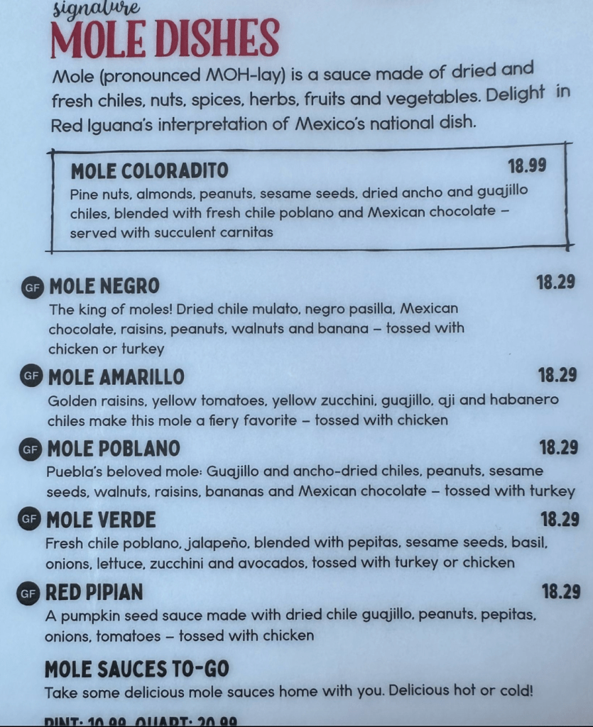 The photo below gives a little snapshot of each of these sauces for those unfamiliar with mole and with curious minds. Ignore the prices. Focus on the descriptions.