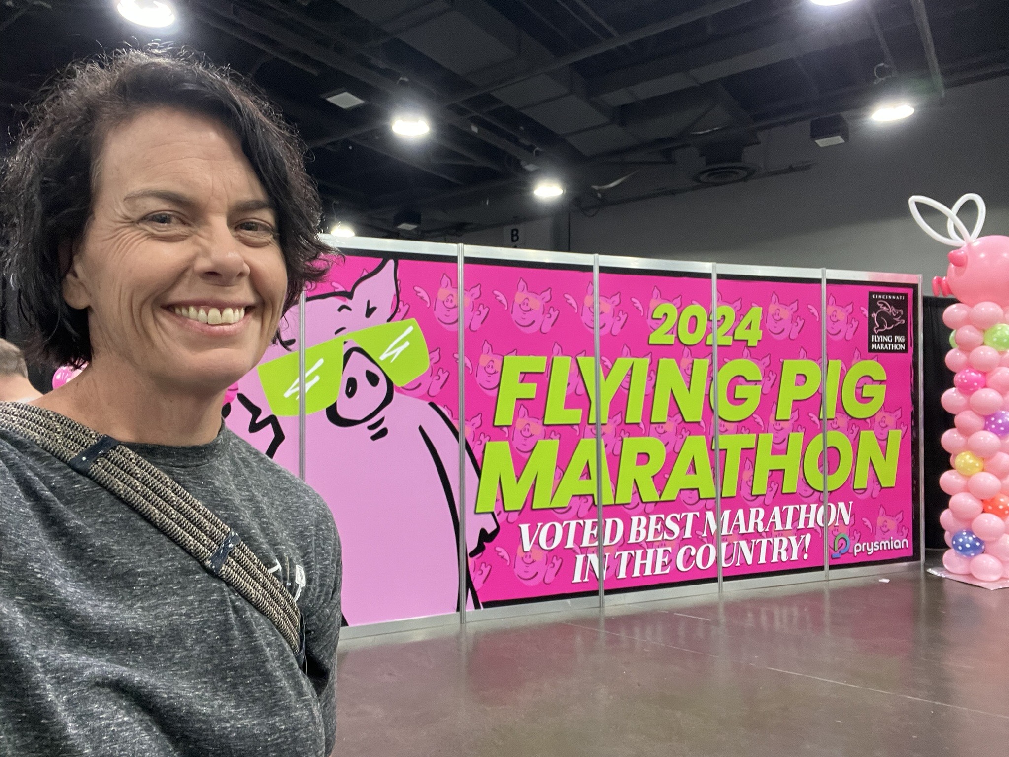 This race is so big, there are even multiple Flying Pig welcome signs and structures in the airport. The 5k and 10k took place on Saturday, so traffic was already pretty gummed up on my Uber from the airport. In case you don’t know, Cincinnati sits on a river. I ended up staying in Northern Kentucky across the river, where the hotels were a bit more affordable. (I later learned that there were a ton of events in town that weekend, including a huge baseball series, that probably contributed to the extremely high cost of hotel rooms.) There was a welcome sign for Flying Pig runners in my hotel lobby. I dropped my luggage then made my way to the expo.