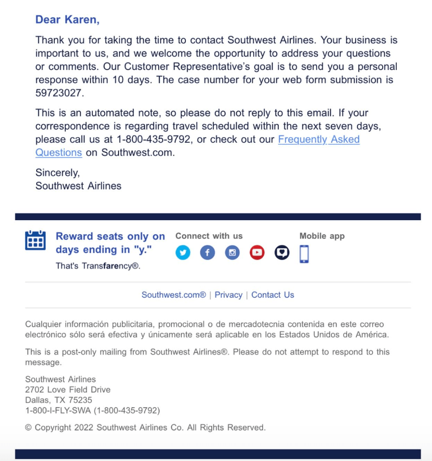 If you opt for the web version (see above), you fill out an intake form. The form notes if urgent relating to travel in 7 days call. You obviously can’t talk to a human because of the magnitude of this airline disaster and because of the list above. So I guess you have to wait 10 days for the corporate response. Well I wonder if that timeline will change with the influx of inquiries?