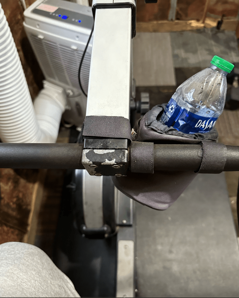 It’s not a pretty sight. I’m in a sweat shack of sorts. It’s got the essentials: music, heat, air and an erg to pedal. That’s all that matters on the rainy day. It’s my tool box for the hour.