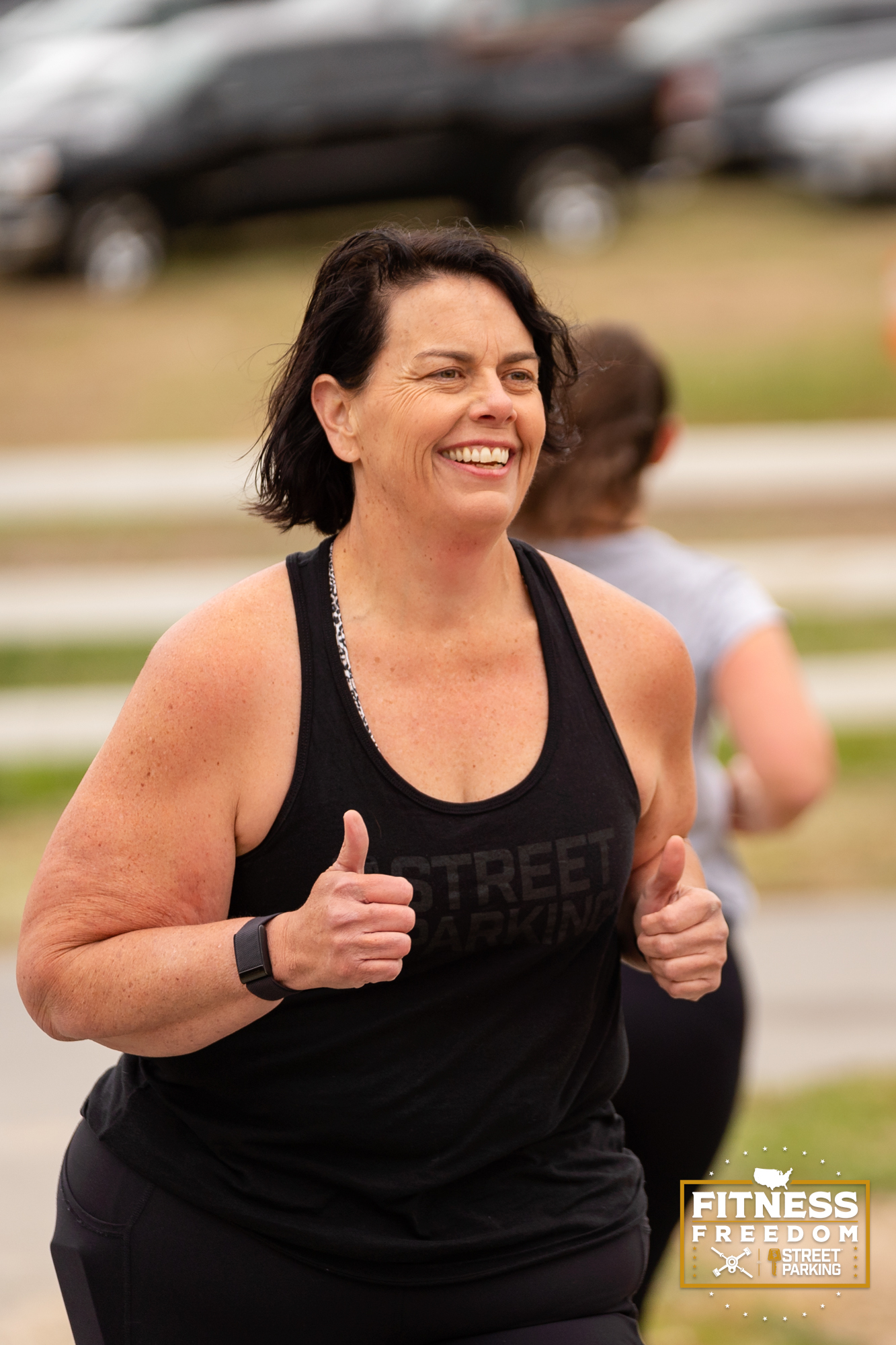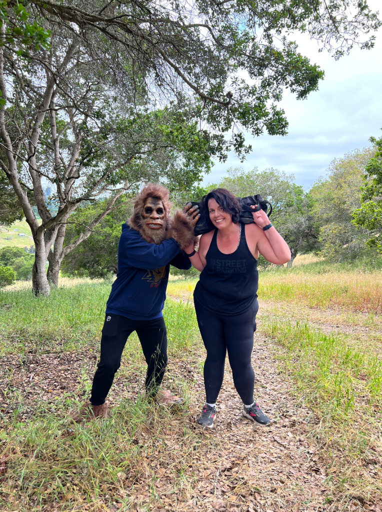 Called “Climb Every Mountain,” it started with a 1 mile run. After that, you did a mile ruck / sandbag carry up the infamous CrossFit Ranch hill. I was the slowest of my heat on the run, but I was smiling and taking in the sights, meeting the people I’d only seen on the screen at the turn around points. Once I got back, I had to choose my weight. I could choose 20, 40, or 60 pounds (or more) to carry…or go with no weight. My home sandbags are 25 and 35 pounds, so I decided to challenge myself with 40. I had done a lot of weighted walking in May, so I felt pretty good about it as I started. It didn’t take me long to realize that the 40 pounds combined with a seriously steep hill was going to be a heck of a challenge. I quickly got to the point where I had to just tell myself to walk 50 paces then drop. Walk 50 paces then drop. I thought the hill would never end. But, I was determined to make it to the top, and make it to the top I did. No time cap on this event so as long as I kept going I knew I would finish. True to fitness fun form, a special surprise guest waited at the top of the hill behind a tree. Yes, I screamed when he jumped out, but then I laughed and had a quick photo opp.