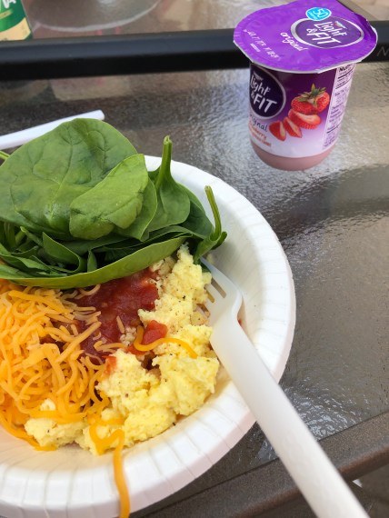 For hotel breakfast (twice): Eggs, spinach, cheese, salsa, light and fit yogurt, coffee with milk. For me, when I’m basically eyeballing things, not really planning eating, and going with my gut, I try to start the day with as much protein as possible and just keep going from there.