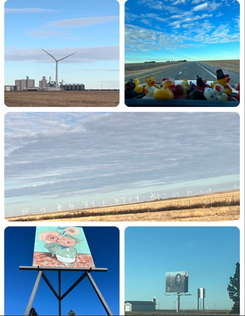 Headed west again. Destination Kansas. The land of lonely roads and windmills. The darkness of night illuminated by red flashing lights. The beacon of not one two or three but hundreds of windmills along the road. Wide open skies and open land for miles and miles. That’s Kansas. Miles and miles of open spaces, a Wheat Jesus and a giant Van Gogh replica. Just a day in Kansas!