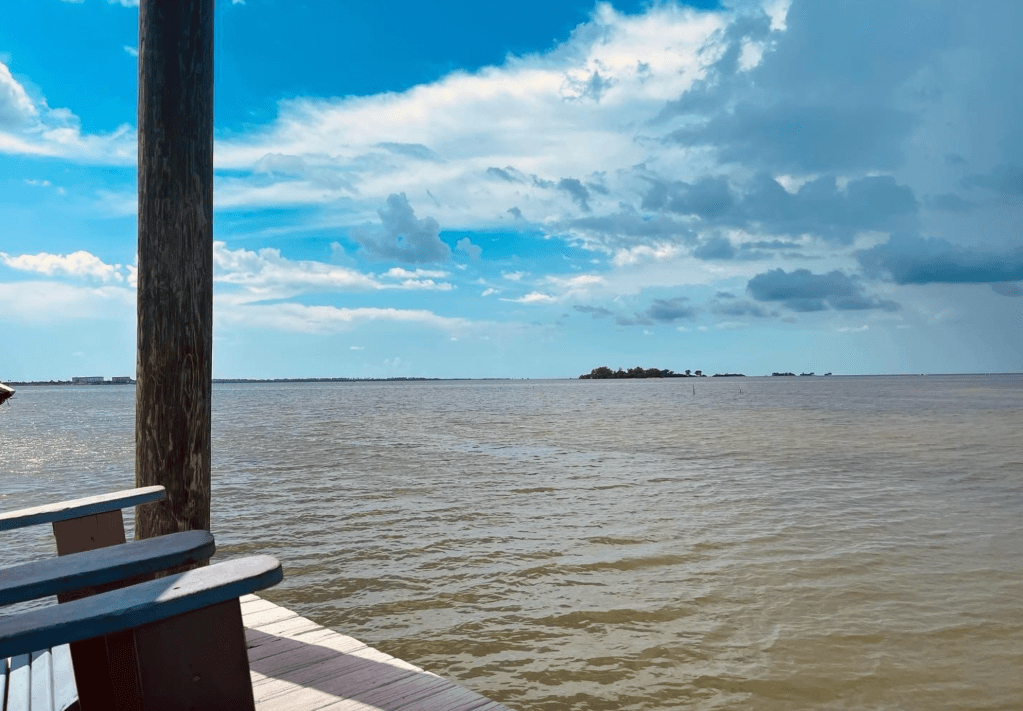A short distance away on the pier there was another view to admire. As the darkness of night fell the glow of the lights under the dock shined green. The water had a glow. The sky was full of random clouds by now. The sky was painting its own Picasso image tonight. Just breathtaking.